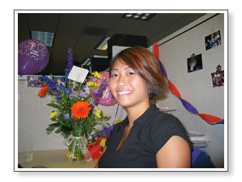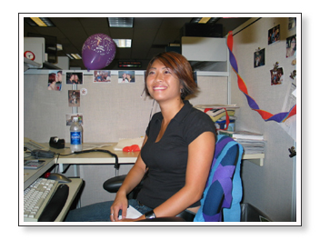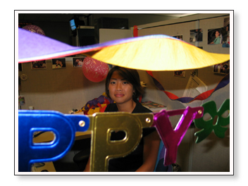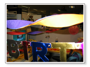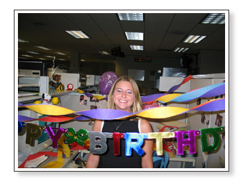 This next set are pictures that we took at work when we decorated Ashley’s cubicle for her birthday. Sarah did most of the work, actually. She pretended to leave so that Ashley wouldn’t suspect anything and then she came back after Ashley left. You’ll see her showing off her handy work below.